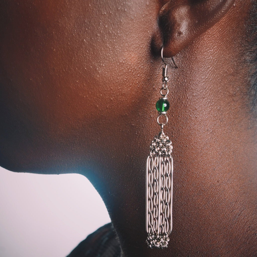 Named after a hero in the Air Force who lost her battle to breast cancer, Sharon was a mentor and an inspiration. This silver earring is about 3 inches long. It consists of an aluminum cleverly wound together into a rectangle with military precision. The rectangle is held up by a green glass bead.
